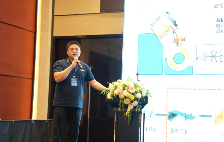 李立军以《新能源汽车电驱系统用高频高性能纳米晶极薄带开发及应用》为题发表演讲,极薄纳米晶合金带材具有显著的性能优势,100kHz条件下,10-12μm带材较14-16μm带材的磁导率由40000提高导60000;40kHz、600mT条件下,10-12μm带材较14-16μm带材损耗降低15%以上。除了新能源汽车,还介绍了极薄纳米晶合金带材在家电中央空调、风电储能变流器、光伏逆变器等的应用案例。