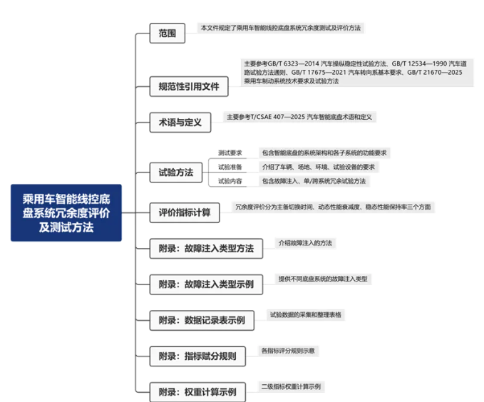 本标准规范了乘用车智能线控底盘单/跨系统测试所需的仪器设备和试验条件,并从驱动/制动/转向系统故障注入试验、试验结果记录与分析计算三个步骤评估乘用车智能线控底盘冗余程度的大小,建立了评价体系:
