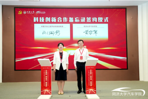 开幕式上,中国汽车工程学会科技创新部副部长刘国芳与同济大学汽车学院副院长黄岩军分别代表双方,共同签署了科技创新合作备忘录。