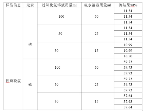 试验表明,无论是用100mL过氧化氢溶液+50mL氨水溶液的混合液和50mL过氧化氢溶液+25mL氨水溶液的混合液,作为前处理条件,所测磷和硫的结果一致性均较好。但30mL过氧化氢溶液+15mL氨水溶液的混合液进行前处理,所测磷和硫元素的结果均偏低,误差超过3%。这是由于溶剂不足,无法将磷充分反应,无法阻止部分硫变硫化氢挥发导致。因此,本文件选用100mL过氧化氢溶液+50mL氨水溶液的混合液作为前处理溶解条件(足够过量)。